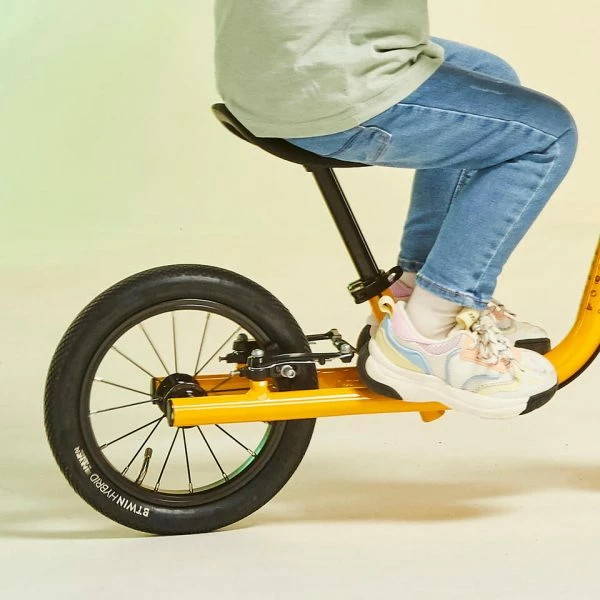 Le repose-pieds l’invite à décoller les pieds, et donc à jouer avec son équilibre. La position du repose-pieds le prépare à mettre ses pieds au bon endroit lorsqu’il passera au vélo.